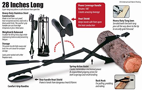 - Feature : Heavy duty stainless steel construction from rust proof heat tempered stainless steel; Handles made with high temperature glass filled nylon / Weighted and balance to allow for lifting heavy logs while maintaining balance and preventing fatigue / Power leverage handle with specially designed heat shield for amazing leverage and heat protection / Flared tongs an back hook for pulling prodding and raking serrated teeth line both tong jaws all the way down to the tip to securely grab firewood / The power handle folds away and locks the unit closed for compact storage looks great racked with other fireplace tools