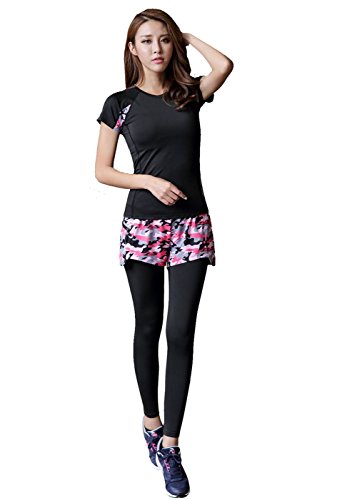 원본상품명: (Ginty)ヨガウェア 半袖 上下セット ショ?トパンツ付き 吸汗速乾 ダンス/?操/ ランニング フィットネス ウェア (迷彩ピンク, M)