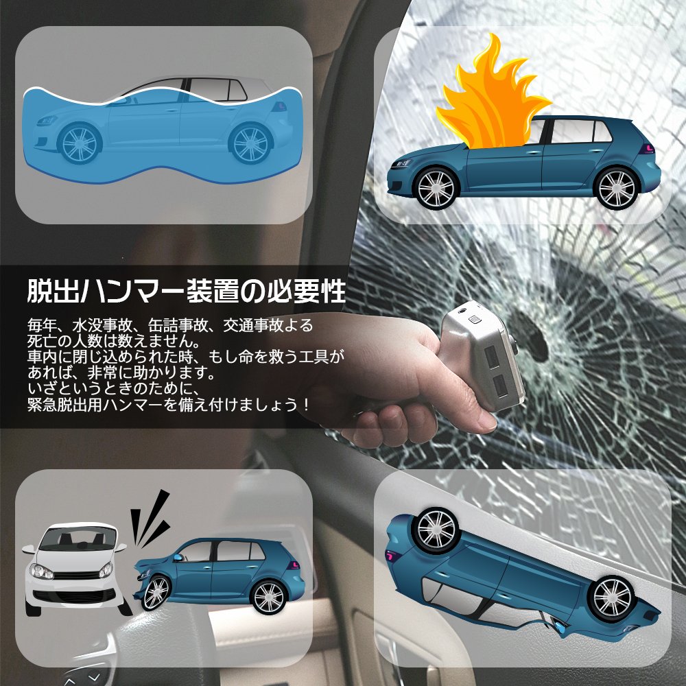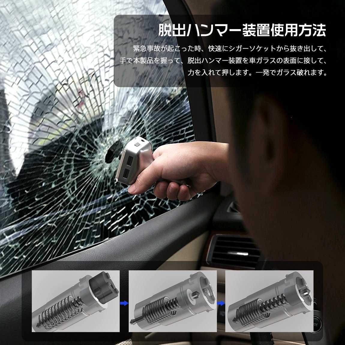 "Escape hammer device" How to use: Pull out from the cigar socket quickly, squeeze the socket part with your hand like the photo, and press the escape hammer device against the glass surface all the time.