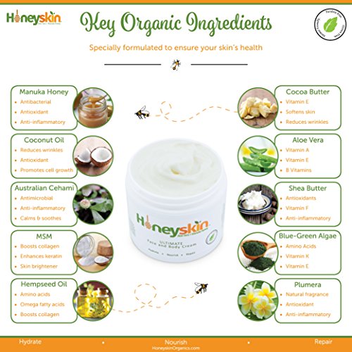 -. Feature : Our SUPERIOR, NATURAL, Organic Nutrient Rich Cream uses Powerful medical grade Manuka Honey for healing, botanicals like Cehami and Plumeria for pain and inflammation, as well as MSM, Aloe vera, Shea Butter, Coconut Oil and Blue Green Algae to soothe and rejuvenate the skin at a cellular level, giving your skin what it CRAVES / Non-Greasy, Absorbs Fully for FAST, effective treatment of Eczema, Psoriasis, Rosacea, Shingles, Redness and Itching. The cream penetrates fully to work INSIDE, not on top. / BEAUTIFUL SKIN IS HEALTHY SKIN - Our cream contains every Vitamin, Mineral, Trace Mineral and Amino Acid your skin needs to FIX itself! MOISTURIZE, NOURISH, PROTECT and REPAIR the skin, PH balanced for face and eyes as well. / No cheap fillers - No Water - No Mineral Oil - No Petroluem - No Parabens - No Fragrance - No Harsh Chemicals - Never Tested on Animals - Non-Allergenic - Most lotions are 60% water and a chemical cocktail which are designed to dry out your skin more! Our first ingredient is Aloe Vera Barbadensis Miller, which is our base and a friend to your skin, transporting the other ingredients to the DEEPEST layers. Our Cream truly HELPS and FEEDS your skin what it needs. / STOP LOOKING, YOU'VE FOUND THE BEST CREAM AROUND. Made in the USA and backed with a FULL MONEY BACK GUARANTEE! Family Owned with Thousands of Satisfied Customers! With 30 years under our belts in the field of organic skin care, we know how to treat the skin, we truly care and will HELP you achieve MAXIUMUM results.