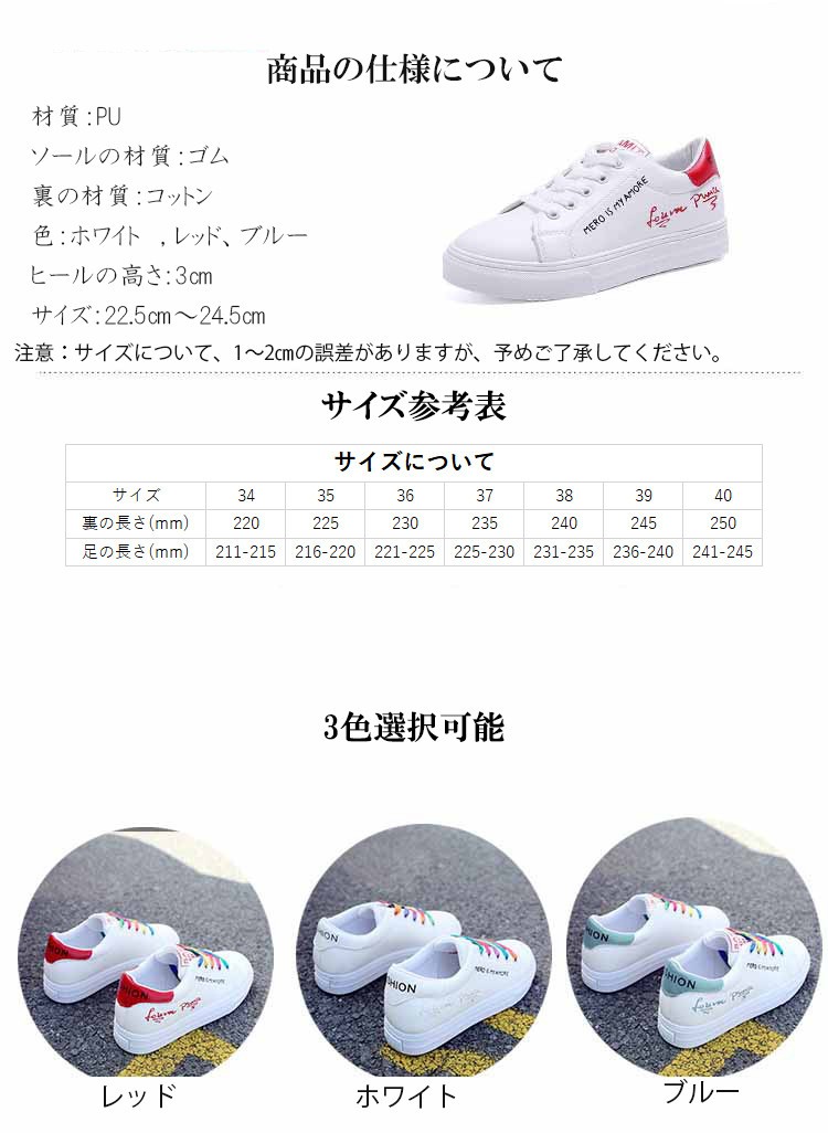 材質:PU ソールの材質:ゴム裏の材質:コットン色:ホワイト レッド、ブルーヒールの高さ:3cm サイズ:22.5cm~24.5cm(一つ大きめのサイズをお勧め)EU36=22.5cm EU36=23cm EU37=23.5cm EU38=24cm EU39=24.5cm EU40=25cm (一つ大きめのサイズをお勧め)注意:※ サイズなど、商品詳細を必ずご確認後、ご了承頂いた上でご購入をお願いします。また、採寸方法違いにより、0.5~1cmの誤差がございますので、ご了承ください。特徴:【軽量、通気性よい】ゴムのソールとキャンパスの材質でスポーツシューズならではの軽さを実現し、通気性もよいです。どんな季節でも着用します。 軽量なので、ランニングや歩くや他の運動が易くになりました。【ファッションな配色】ファッションな配色で、シューズがファッションになり、女性に最適です。中学生などに通学靴としてもよい選択です。 【ゴムのソール耐滑】柔らかい材質で作って、ゴムのソールので、耐滑のです。スムーズな足運びをサポートします。球技や他の運動にもスムーズになりました。【利用場合】スポーツだけでなく、通勤や通学やアウトドア、普段履きとしても カジュアルなコーディネートをお楽しみい ただけます。