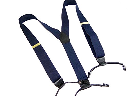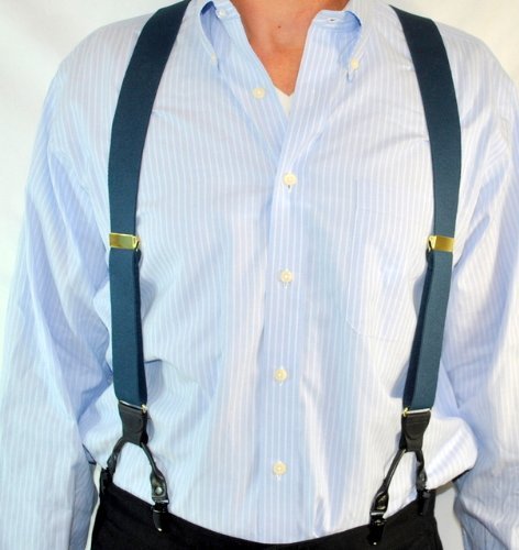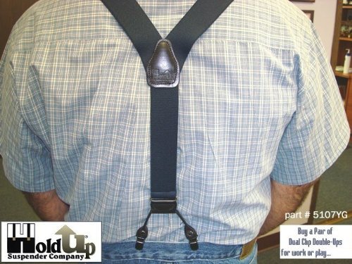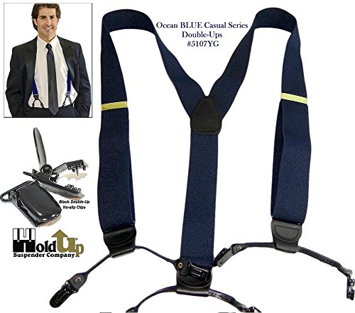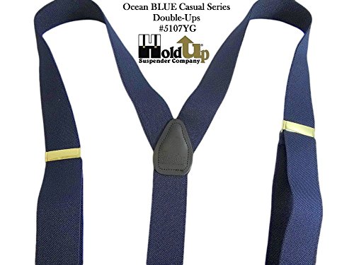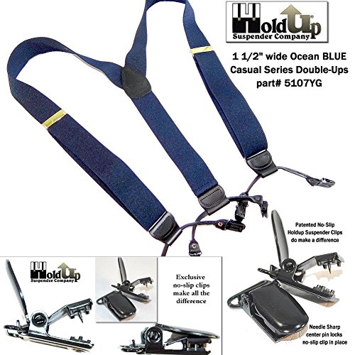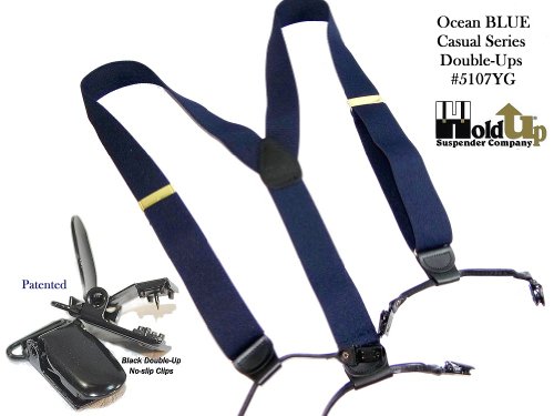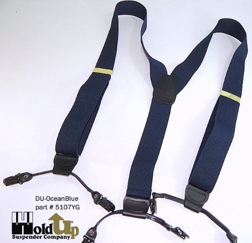 Binding : Apparel Product Description Dark Ocean Blue 1 1/2" wide elastic jacquard poly-blend fabric straps with gold tone adjuster and top grade black leather trim. These are adjustable in length to 48". These dark blue Double-Ups® have the traditional style mirroring the look of button-on suspenders worn since they were first invented. By eliminating the custom tailoring requirement to sew suspender buttons onto every pair of pants you wish to wear with these navy blue suspenders, you can now easily attach these Double-Ups® to your entire wardrobe of dress and casual pants in a snap. Get the aesthetic look of "old style button-on braces with the convenience and ease of our No-slip® clips. Exclusive design feature of these suspenders is we eliminate the proverbial waistband rollover caused by button-on braces, which pull at the middle of the waistband. These are just as great with khaki slacks, jeans or dress pants for both a casual or dressy look. The poly-blend fiber used in this series of Hold-Up® Suspenders has a nice flat coarse weave finish, while offering stain resistant and water resistant properties. These make more than a conservative fashion statement at the office or out on a date! Pick out several pair of Hold-Up® Double-Ups® in various colors sold here at Amazon which all have a Y-back top grade black leather crosspatch embossed with our HoldUp logo. Great color and these make a great birthday, Father's Day or special occasion gift for that special man in your life. All materials are carefully chosen for elastic durability with a durable weave and colorfast dyes. If you need a pair of suspenders that perform year after year...then we'd always suggest a pair of Ocean Blue Hold-Up® Suspenders for you or a friend in the single- or dual-clip styles. Hold-Up® is proud of our no hassles, no questions asked, 30 day money back guarantee we offer to our Amazon shoppers. 0