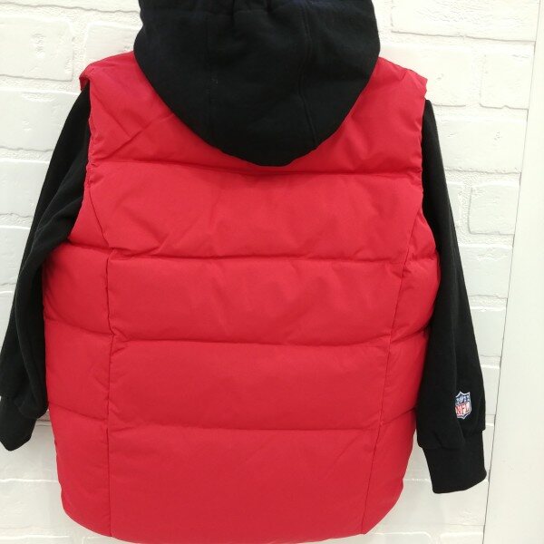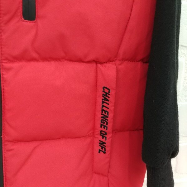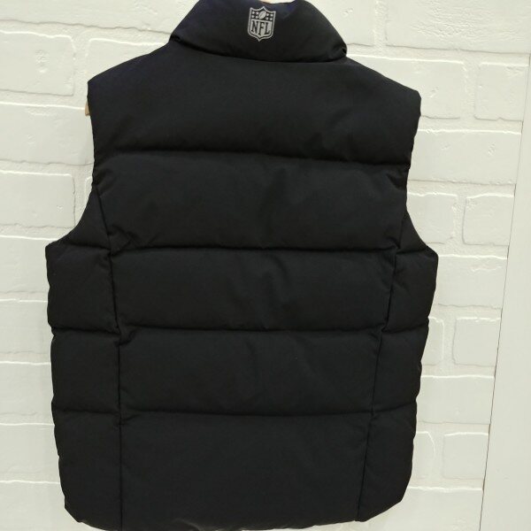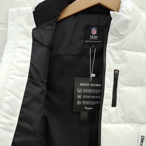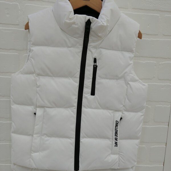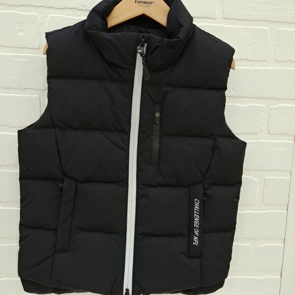 지퍼와 레터링 자수로 깔끔하게 포인트를준 공용 오리털 화섬 조끼, 포켓안,뒷목 안쪽에 라이렉스 기모를 덧대주어 따뜻하게 착용 가능.