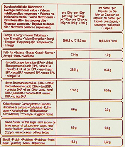 -. Feature : Hochkonzentriert mit 1000mg Omega3 pro Softgelkapsel! / Ohne unnötige Zusatz- und Füllstoffe! / Reich an wertvollem EPA (34%) und DHA (24%)! / Dieses Produkt ist kein Ersatz für eine ausgewogene und abwechslungsreiche Ernährung sowie eine gesunde Lebensweise.