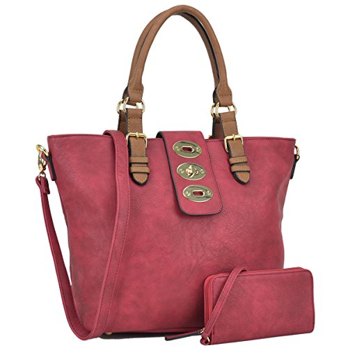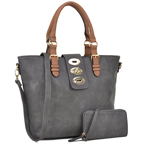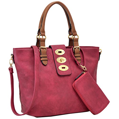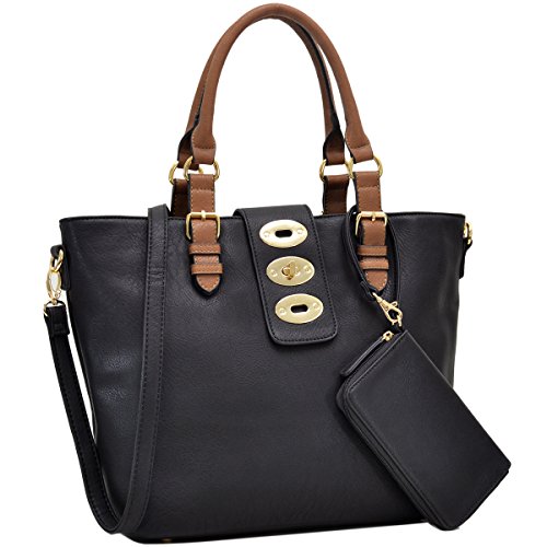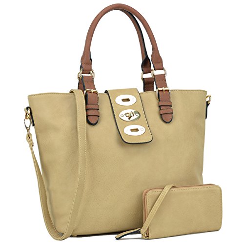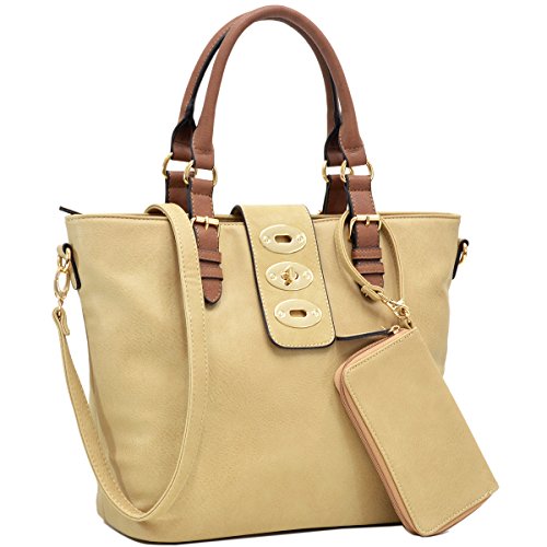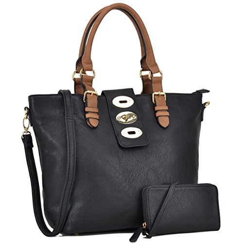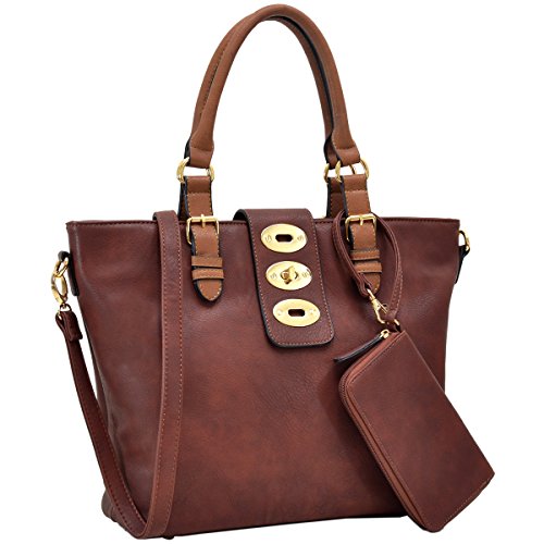 ·Soft Faux Leather ·Adjustable Twist Lock ·Adjustable and Detachable Shoulder Strap ·Rolled Belted (coffee colored) Faux Leather Handles ·Gold tone hardware, accents, bottom studs and adjustable twisted lock ·Interior Front Wall Open Top Item Pockets ·Interior Back Wall Zipper Pocket ·Full-Lined Fabric Interior ·Exterior back wall zipper pocket ·Matching Wristlet. (Size: 7"x4"x1") ·Approx. Size: 17"W x 11.5"H x 7"D ·Handle Drop Length: 8' ·Shoulder Strap Length: 48' 0