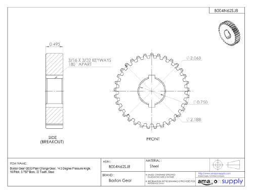 Boston Gear GB33 Plain Change Gear, 14.5 Degree Pressure Angle, 16 Pitch, 0.750" Bore, 33 Teeth, Steel