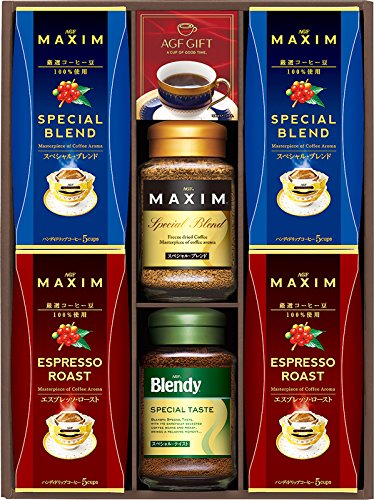 原材料:マキシムスペシャルブレンド65g、ブレンディスペシャルテイスト70g、マキシムハンディドリップ(スペシャルブレンド8g・エスプレッソロースト7g)×各5P×各2