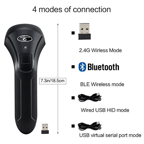 - 【Dual 2.4G Wireless + Bluetooth Wireless Barcode Scanner】2.4G wireless scanning, plug and play, no need to install any software. Bluetooth Wireless scanning, password bypass direct connection, enable bluetooth again will auto connect after being disconnected.
