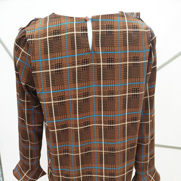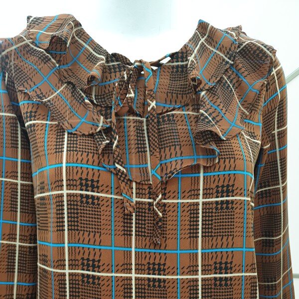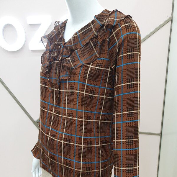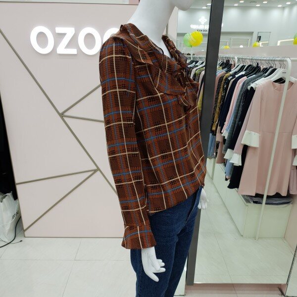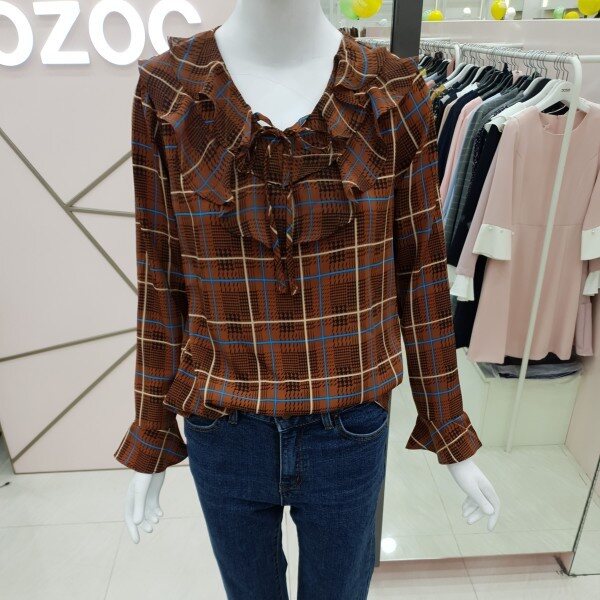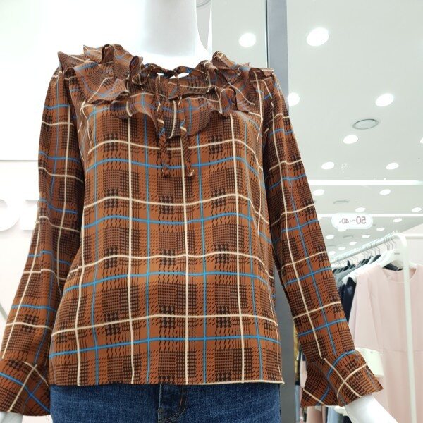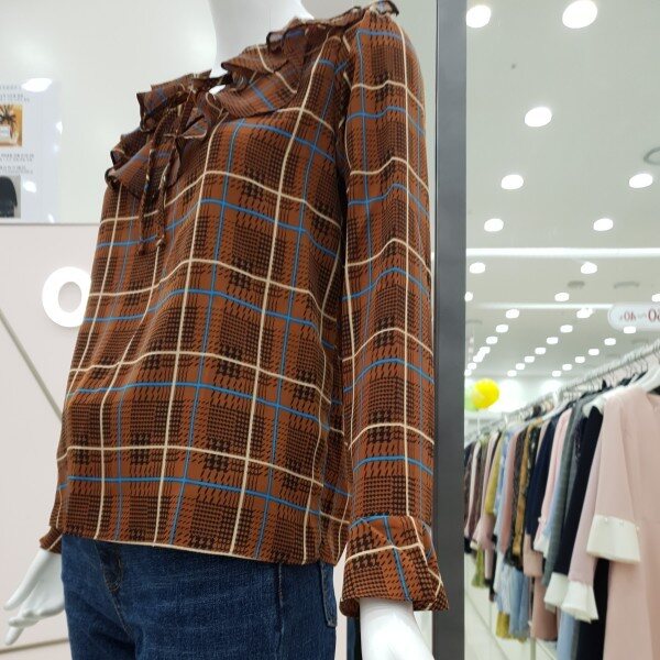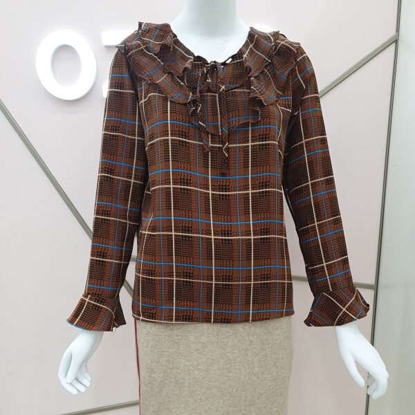 부드럽고 톡톡한 소재감으로비침전혀없고 이중프릴 리본 체크블라우스예요가슴둘레94총길이58