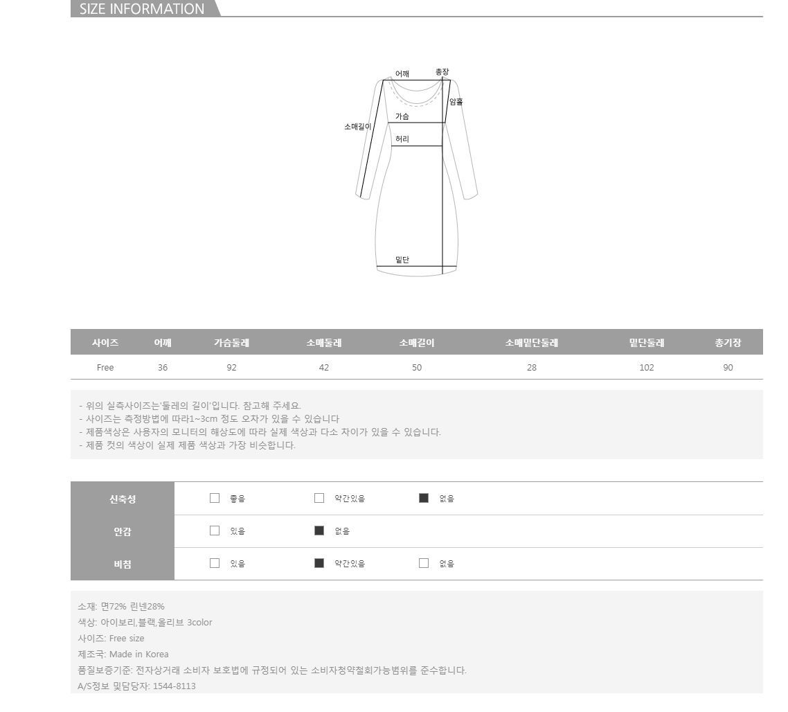 피부에 닿는 촉감이 편안해 누구에게나 이지한 착용감을 자랑하는 코튼과 어떤 페브릭보다도 쾌적하고 시원한 느낌을 선사해주는 린넨 혼방 소재로 산뜻한 S/S 시즌에 알맞는 원단감이라 썸머 시즌 코디에도 GOOD~ 바디 라인에 피트되는 부분 없이 간결하게 떨어지는 라인으로 우아한 멋이 느껴지며 깔끔한 라운드 네크라인으로 마냥 여성스러운 느낌만 가진게 아닌 포멀한 스타일로도 풀어내주어 피팅 시 더욱 만족스러우실거에요:) 베이직한 디자인으로 심플한 듯 하면서도 바디 부분에 심심치 않게 절개 라인 디테일을 선명하게 더해주어 고급스러운 분위기도 한층 더 UP-! 무릎 기장으로 내려오는 차분한 길이감이라 오피스룩이나 격식있는 모임 장소에서도 심플하게 즐겨보시기 좋아 적극 추천드릴게요-♡
