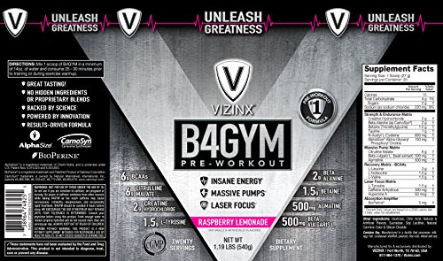 -. Title : VIZINX B4GYM Raspberry Lemonade Pre-Workout 1.19 LBS/27 Grams Per Serving.The #1 Best Formula with Citrulline Malate, Agmatine, BCAA Post Recovery Matrix...Insane Energy, Massive Pumps & Laser Focus.