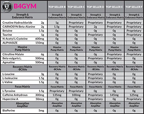 -. Feature : If you desire an advanced pre workout that balances great taste with extreme performance utilizing licensed materials to ensure purity, quality and consistency without the mystery of proP.R.Ietary blends then checkout B4GYM. / 7 g Massive Pump Matrix Includes 500 mg of Agmatine / Serving / Recovery Matrix Includes 6 g of BCAA's 2-1-1 ratio plus Absorption Amplifier Bioperene / 7.25 g Strength & Endurance Matrix with Zero Crash & Laser Focus Matrix that also Includes 1.5 g of L-Tyrosine 300 mg of Caffeine Anhydrous + 50 mcg of Huperzine A / VIZINX B4GYM IS MADE IN THE USA and is backed by our 100% Money Back Guarantee, we are always excited to meet and exceed our customer's expectations.