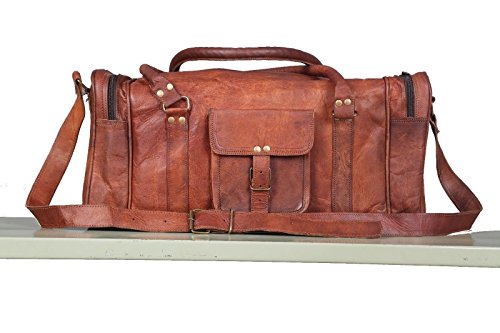 -. Feature : Colour: Brown; Leather: Goat Leather; Size: 22 (L) x 10 (H) x 10 (W) inches / Two additional big zip pockets, one on each side. 1 Big Inner Compartment, 1 Front Pocket. Brass buckles and fittings. / Vintage Leather Duffle Bag: It Is Handcrafted Using Pure 100% Genuine Goat Leather. Natural processed leather - chemical free, non-allergic and eco-friendly. Brass/ Metal Fitting Buckles and Holders and Internally Lined with Strong Green Canvas make it Durable and Long Lasting. / Multi utility bag can be used as a travel bag, gym duffel bag, sports duffel bag, overnight bag, weekend cabin duffel bag, carry on duffel etc. / Buy Genuine Bag from HANDCRAFTED EXPORTS only! Beware of fake replicas. THANKS FOR SHOPPING.....