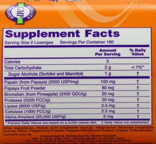 -. Binding : Health and Beauty -. Brand : NOW -. Label : NOW -. Manufacturer : NOW -. PackageQuantity : 1 -. ProductGroup : Health and Beauty -. ProductTypeName : HEALTH_PERSONAL_CARE -. Publisher : NOW -. Studio : NOW -. Title : NOW Foods - Papaya Enzyme Chewable