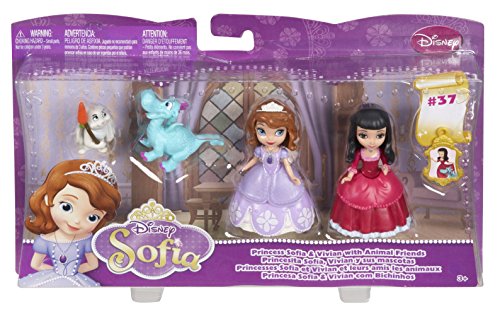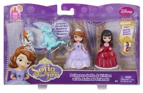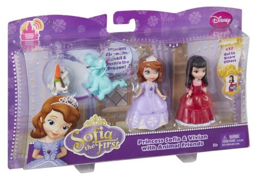 Girls are invited to join Sofia the First and her princess pal from Royal Prepatory Academy, Vivian, on a very special playdate with their animal friends. Sofia's new friend wears her signature red gown and is accompanied by her delightful pet dragon, Crackle. Sofia wears her signature purple gown and comes with the always-hungry Clover the Rabbit, who is ready to "roast" carrots with his new dragon friend. Both dolls unlock phrases in the Magical Talking Castle (sold separately).Feature