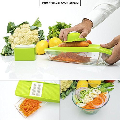 SLICE, JULIENNE & WAFFLE ALL YOUR VEGGIES: Whether you want to grate cheese, slice potatoes, cucumber, carrot, ginger, garlic, fruit or even julienne zucchinis and carrots, this efficient vegetable mandoline cutter will do it all!