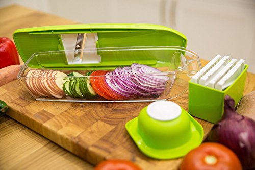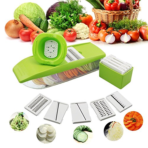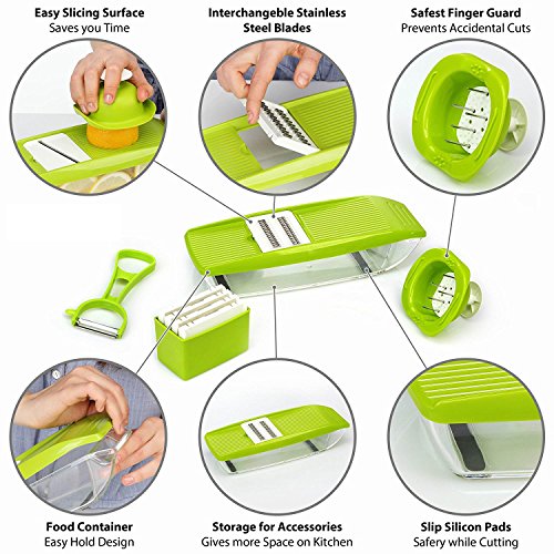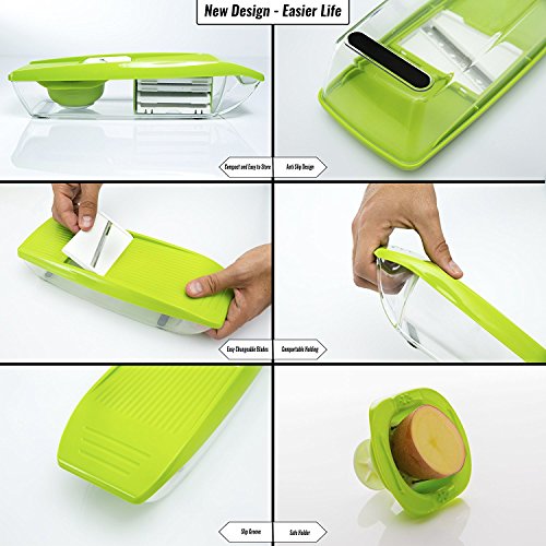 FAST AND MESS-FREE FOOD PREP: 5 interchangeable stainless steel slicers and shredders including 2.5mm shredder, 1.5mm shredder, 2.0mm slicer, 3.0mm slicer, and wavy slicer to create all kinds of fruit and veggie slices. Blade storage box is included.