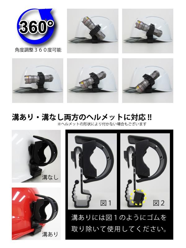 Φ16mm~Φ30mmまでのFlashlightがヘルメットに装着出来ます。角度調整は360度調整可能です。