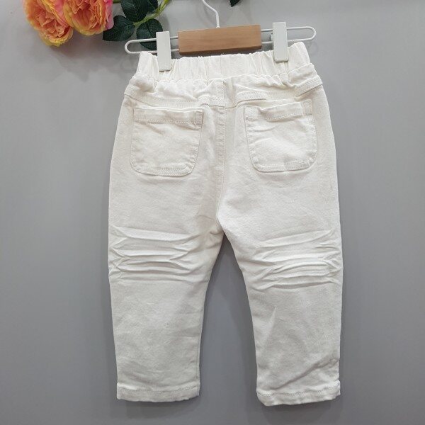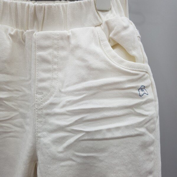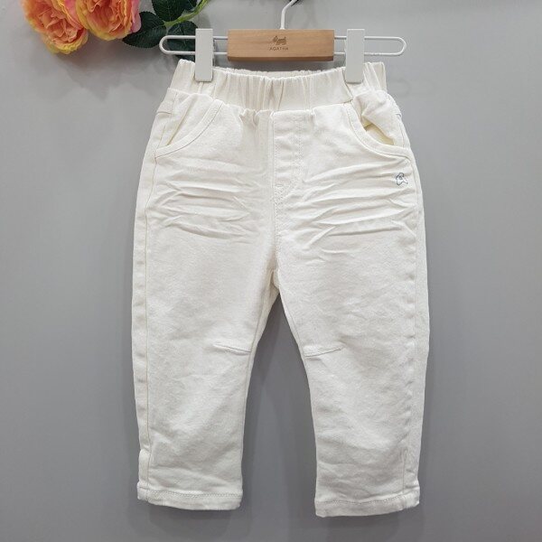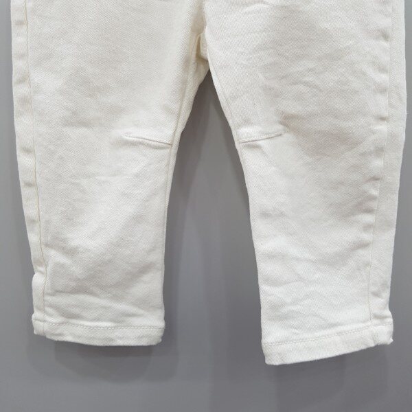 스판성 좋은 화이트 데님 소재를 사용한 배기 팬츠입니다.다트 장식과 배색 로고 자수로 포인트를 주었습니다.