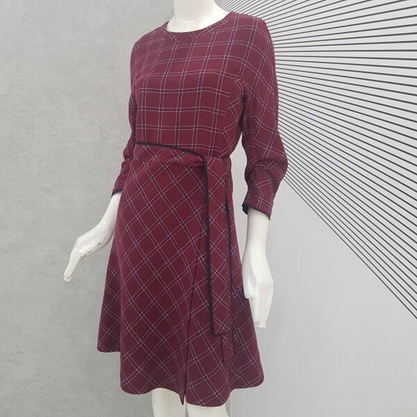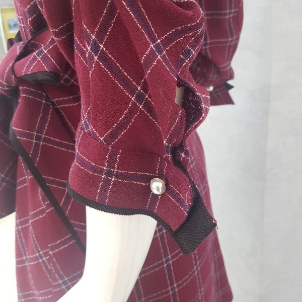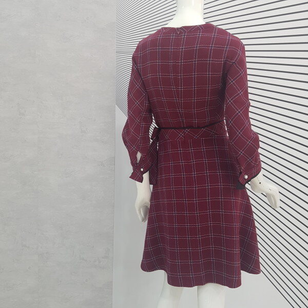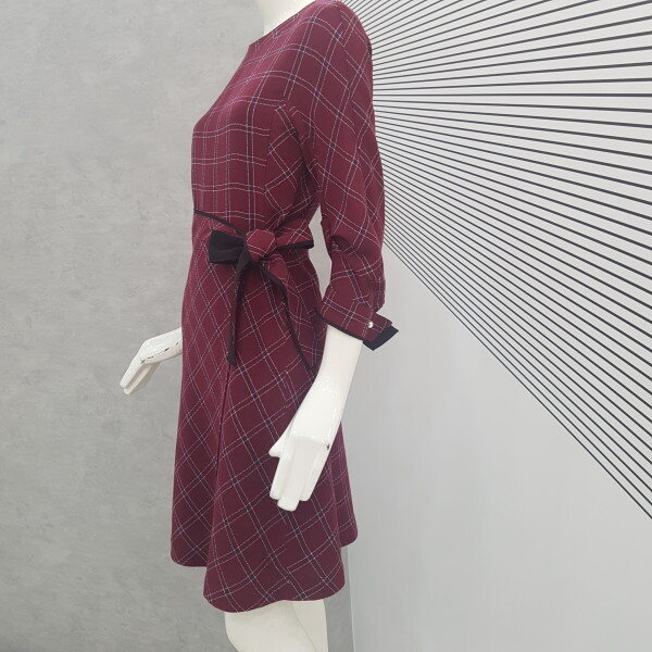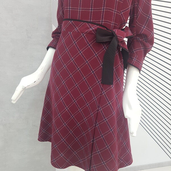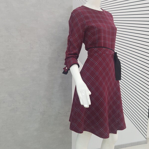 짙은 와인바탕에 귀엽게 체크무늬가 있는 플레어 원피스예요