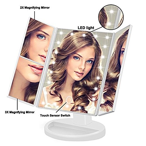 FOUR MIRRORS IN ONE: This is a beauty mirror with light and magnification. You can magnify 2X, magnify 3X, illuminate the main panel with 22 LED's, or just use the regular mirror panel.