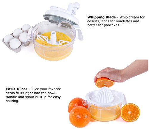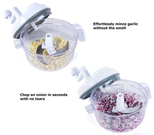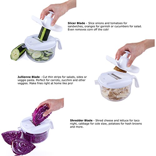 - VERSATILE – Perfect for slicing vegetables, chopping nuts, herbs, salsa, hummus, guacamole and more. Chop onions in seconds without crying and garlic without stinking up the kitchen. Chop veggies, whip eggs for omelets, shred cheese, make hash browns and juice oranges all with one tool! Manual operation allows you to achieve the consistency you want. Spin a few times for large chunks, spin more for smaller ones, and keep on turning if you want to puree the food.
