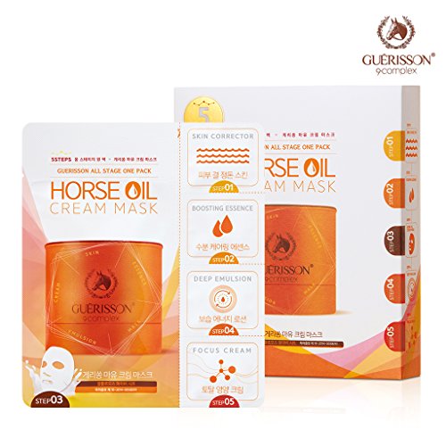-. Feature : Step 1 : Guerisson Skin 1.5 g / Step 2 : Guerisson 9-complex Essence 1.5 g / Step 3 : Guerisson Horse Oil Cream Mask 27 g / Step 4 : Guerisson Lotion 1.5g / Step 5 : Guerisson 9-complex 1.5 g / The Best At-home Therapy for Beautiful Skin : This intensive at-home skin care program helps you enjoy spa-graded results in the comfort of your home. / Quickly Strengthens Skin : This multi-step product visibly improves weak, damaged skin and nourishes it with Guerisson's signature ingredient, horse oil. / Cares For Skin from the Inside Out : Instead of moisturizing just the surface of your skin, this program nourishes and illuminates your skin from the inside out and locks in moisture and nutrients, really promoting firm, smooth, glowing skin. / Re-energizing German Horse Oil : This oil from herbivorous horses is affinitive with human skin as it has a structure similar to that of human sebum. It is enriched with unsaturated fatty acids, proteins, vitamins, and ceramides that promote firm, glowing skin.