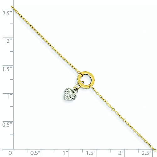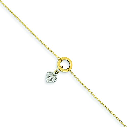 14k Two-Tone Gold Circle Diamond-cut Puff Heart With 1inch Ext Anklet - 9 Inch - 1.1 Grams in 14k Yellow Gold and White Gold - JewelryWeb Style: QTA213033YW - FREE gift-ready jewelry box