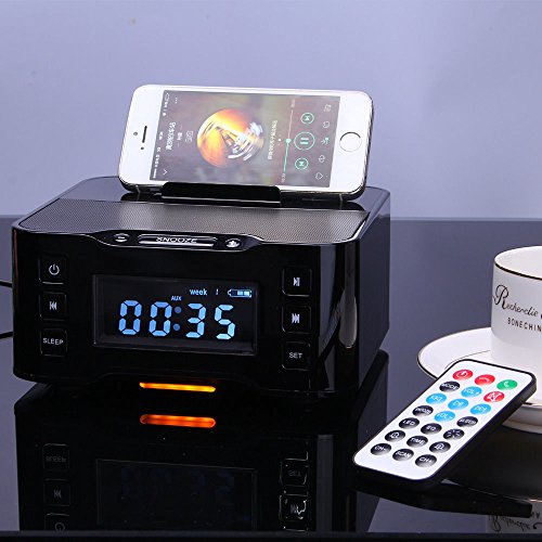 -. Feature : 1. Docking station can be rised and falled, the iphone 6S/6S Plus/6 6 Plus 5S/5C/5, 4S, android Micro 5 pin mobile phones can be directly inserted into playing and charging,interface can plug replacement(iphone4(30pins),iphone6,android(micro 5pin) mobile phone). / 2.The folding mobile phone support, keep the cell phone charging, the movie is very convenient(mobile phones can be placed horizontally).The function of alarm (for the alarm clock every day and day). / 3.The built-in FM radio.Stereo bluetooth and bluetooth hands-free calls, with a NFC function. The speaker power 5w x 2, sound quality is very good. / 4.U disk play and USB charging. LCD display, backlight brightness can be adjusted. The standard 3.5 mm audio input interface play songs any phone or computer. / 5.A full-function remote control design.Decorative lamp At the bottom can be controled ON or OFF by switch.