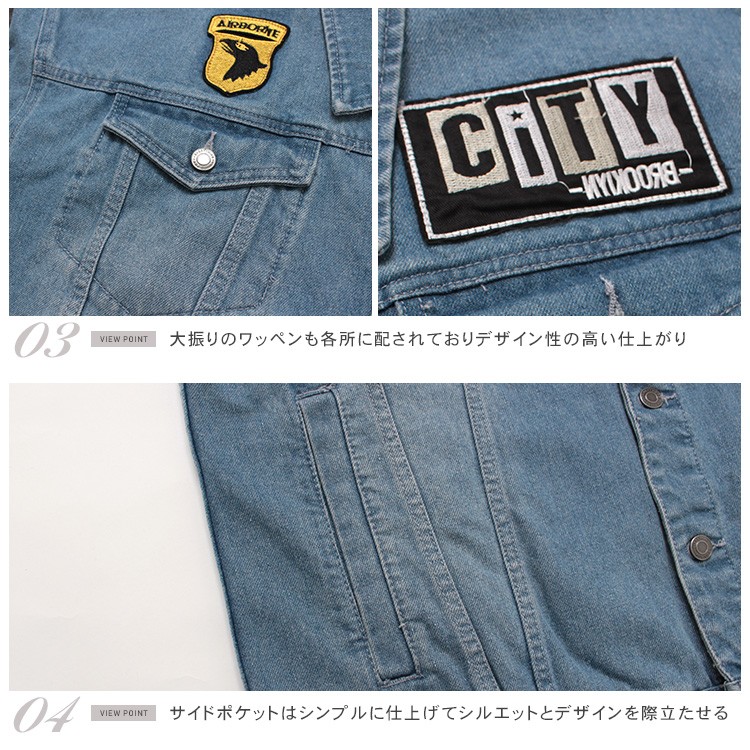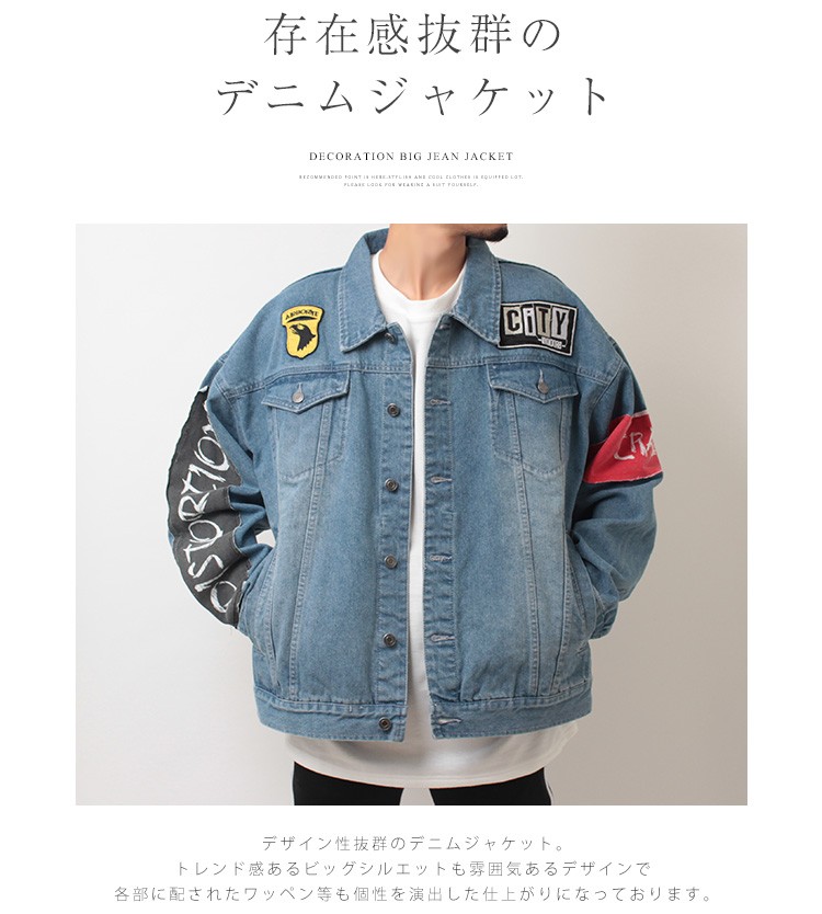 デコレーションビッグジージャンデザイン性抜群の個性派デニムジャケット。トレンドのビッグシルエットにワッペンやバックススタイルのロゴデザインも存在感あるアイテム。定番のデニムアウターなので着こなしの幅も広く使い勝手の良いアウターとなっております。ミディアムウエイトの生地感でインナー次第で秋口から春先までロングシーズン活躍してくれるアイテムです。◆サイズ(着丈/身幅/肩幅/袖丈)※cm:【FREE】68/63/65/58◆モデル情報:身長:176cm / 体重:58kg / 着用サイズ:FREE◆素材:綿80% ポリエステル20%◆カラー展開:ブルー(1)ANTENNAMENS アンテナメンズ
