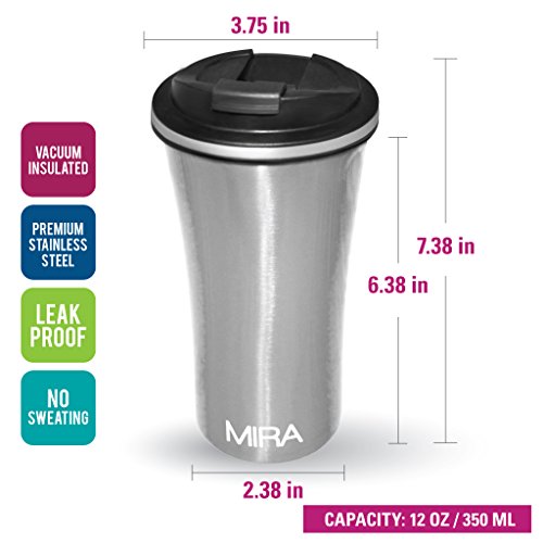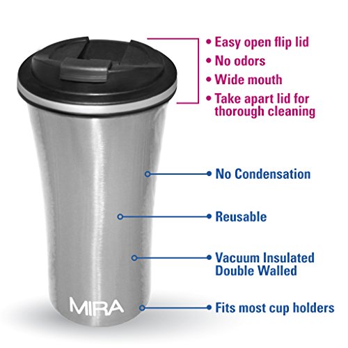 -. Feature : EASY CLEAN, NO ODORS, DURABLE: Stainless steel makes the MIRA Car Mug a cinch to clean. A quick wash at the sink will dispose of any residue and leave your mug fresh and ready for your next beverage. This includes the lid; unlike other coffee mug lids, the MIRA Car Mug lid comes apart for complete and easy cleaning. The entirety of the lid can be cleaned so no coffee or milk deposits remains, which means no odors at all. / REUSABLE, UNBREAKABLE: A more eco-friendly option than paper coffee cups or plastic water bottles, the MIRA Car Mug helps to reduce your carbon footP.R.Int while keeping all of your beverage fresh and tasty. The durable design allows for the mug to be accidentally knocked over without causing a disaster. / VERSATILE: The practical use of this mug extends way beyond your car. Fill it with your favorite hot or cold beverage and keep it on your desk at work, take it with you to a weekend sporting event, use it to stay hydrated during a hike or even to keep your cocoa warm while watching old movies at home. No matter what beverage you prefer, coffee, tea, water, soda or juice, hot drinks will stay steaming for 12 hours and chilled liquids will stay cool for 24 hours. / SLEEK DESIGN: A perfect fit in your car's cup-holder and also easy to hold, the Car Mug is designed with comfort of use in mind. An easy to use flip lid makes drinking in stop-n-go traffic a cinch; say goodbye to coffee spills. The large 12 oz /360ml capacity will keep you satiated and hydrated throughout your commute. And the wide mouth is designed for easy filling and drinking. / STAINLESS STEEL, DOUBLE-WALL, VACUUM INSULATED: The Mira Car Mug keeps your favorite beverages piping hot for 12 hours or frosty cold for 24 hours. No more lukewarm coffee during your commute to work; your caramel latte, macchiato, hot tea or any other beverage will remain fresh and delicious all the way to the last drop. Iced drinks will remain chilled and refreshing throughout your day. The premium grade 18/8 stainless steel, vacuum insulation and double wall construction will protect the taste and temperature of all of your beverages.