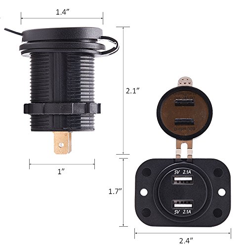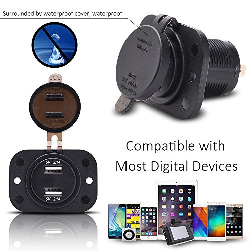 [Easy Notice Voltage Status] - built in intelligent voltage monitor_ with LED digital display_ it real time shows you the accurate voltage status of car or motorcycle_ more secure for driving [Dual USB Fast Charger] - dual USB interface design with single output of 2.1A (max total output of 4.8A)_ it quickly charges for most smartphones_ tablets_ GPS_ digital camera_ PSP/MP3/MP4 and other USB-devices [Safety Protection] - it``s certified by CE & ROHS with Overload_ Over-current and Short Circuit Protection to ensure charging safety_ meanwhile_ built-in converse connection protection that ensures the circuit won``t be burnt out if wrong wiring [Reliable Durability] - made of fireproof ABS material with IP66 waterproof rating_ the tight fitted cap over the USB interface displays the voltage readings as well as effectively protects the charger against sudden splashes [Simple Panel Mount] - come with a free mounting panel for you to mount it depending on your preference_ simple fast setup in about 20 mins_ fits most SUV_ ATV_ RV Car_ Boat_ Motorcycle and other 12-24V Vehicles