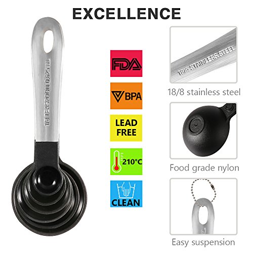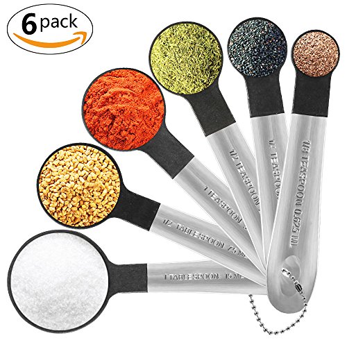 - ◆ SIX SPOONS OPTIONS. Set of 6 measuring spoons: 1/8 tsp-0.625ML, 1/4 tsp-1.25ML, 1/2 tsp-2.5ML, 1 tsp-5ML, 1/2 Tbsp-7.5ML and 1 Tbsp-15ML. There are volume carving on the spoons, choose the right measure spoon for scientific cooking.
