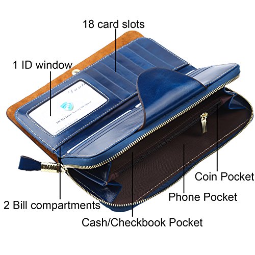 -. Feature : REAL LEATHER - Top grain leather with wax finish, feels luxury and comfortable. Looks even better after using for a long time. / SAFETY & P.R.IVACY - Our wallets are equipped with advanced unique proP.R.Ietary blocking material, which blocks RFID signals and protects the valuable P.R.Ivate information stored on RFID chips from unauthorized scans. Tested & Approved by Independent Test Lab.Tested from 10MHz to 3000MHz, including 13.56 MHz in which the credit cards operate. / FUNCTIONAL DESIGN - 18 credit card slots, 1 clear slot for ID, 2 full-length bill compartments, 2 Large Cash/Checkbook/Phone pockets,1 zippered pocket for change. Keep your credit cards,cash,coins,bills,cheekbook and cell phone well organized. FIT for iPhone 6/6S/7 Plus. / Dimensions - 7.67"L x 3.75"W x 1.4"H, It is just the size for a wallet you can simply hold it on hand or put it in bag.Comes with a quality presentation gift box,great for a gift. / 100% MONEY BACK GUARANTEE - We know you'll love our wallet as much as we do, If for any reason you're not 100% SATISFIED, let us know and our customer service team will make things right: full refund or a free replacement, whichever you prefer.