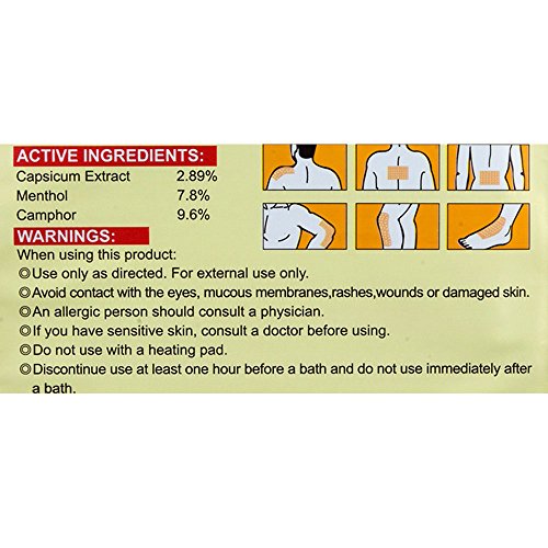 -. Feature : Use all natural Capsaicin, the P.R.Imary compound in hot peppers and clinically proven to reduce the sensation of pain / Each patch can be worn up to 8 hours at a time / Can be used to soothe sprained ankles, achy necks and wrist pains / Package: 1Pcs/Bag,15Bags/Lot