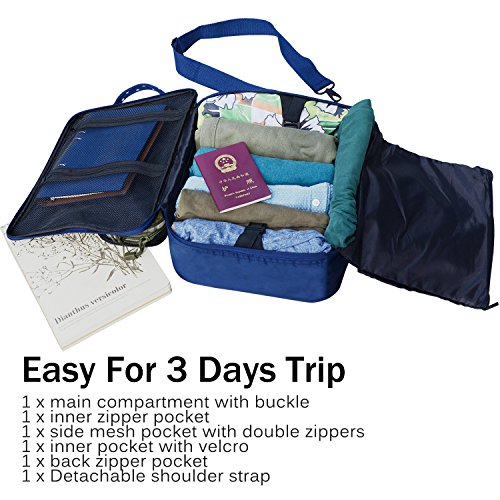 - 3.LARGE CAPACITY—1 x Main compartment with buckle. Easily for keeping clothes,towels,skin care products; 1 x Mash pocket with zipper.Keeping charger,power bank or something you convenient to take; 1 x Inner pocket with velcro.Keeping passport,files,wallet,check books etc; 1 x Inner pocket with zipper. Keeping washing articles etc; 1 x Back compartment with zipper.You can use it as a pocket or fixed in the pull rod box.