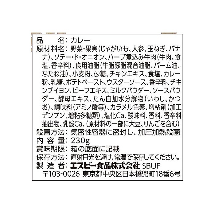 원재료:야채 과실(옥파,감자,(당근)인삼,바나나)고, 쇠고기,식용유지(팜유,콘유,대두유,이군요 유,미강유)고, 소맥분,설탕,치킨 bouillon,식염,카레분,유당,향신료,우스타 소스,사과 과즙,수 엿,비프 엑기스,밀크 파우더,소스 파우더,효모 엑기스,단백 가수분해물(정어리,가다랭이)고, 카라멜 색소,조미료(아미노산등)고, 인산염(Na)고, 신맛료,증점다당류,향료,유산Ca,(그 외 젤라틴 유래 원재료를 포함한다)