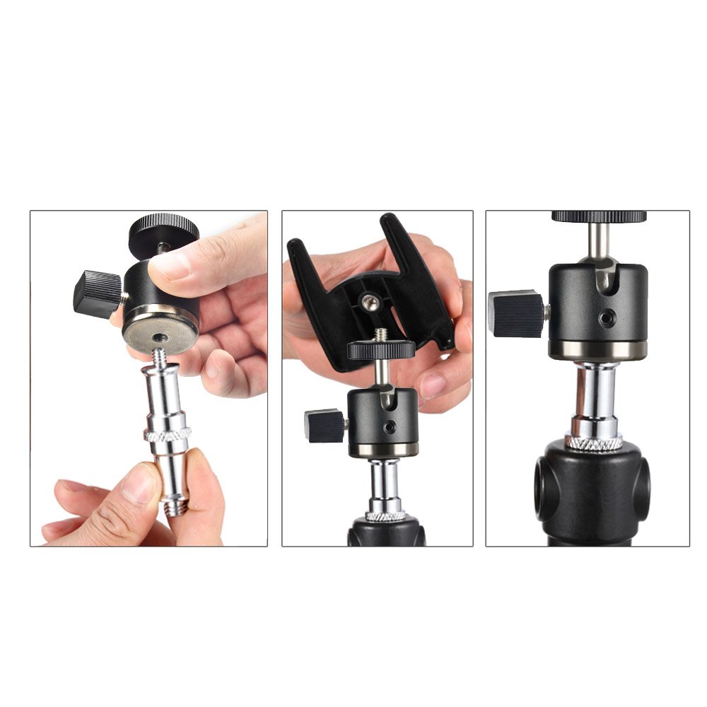 There is a 1/4 screw hole in the bottom of the camera platform, it can be fixed to a tripod stand, light stand, etc.!