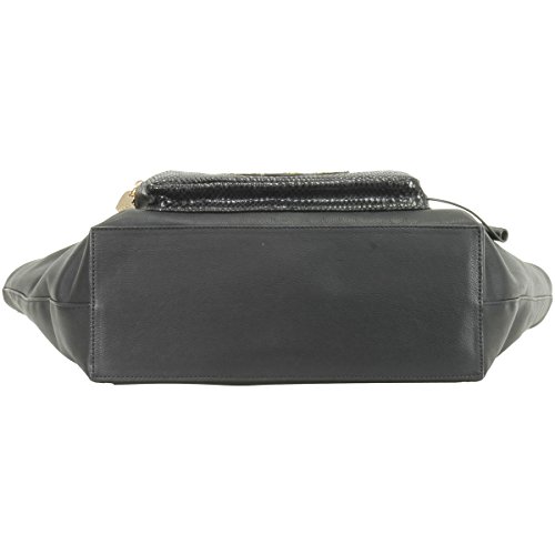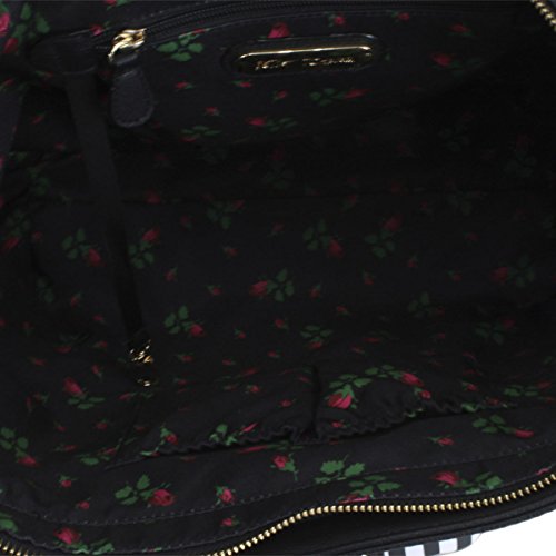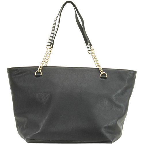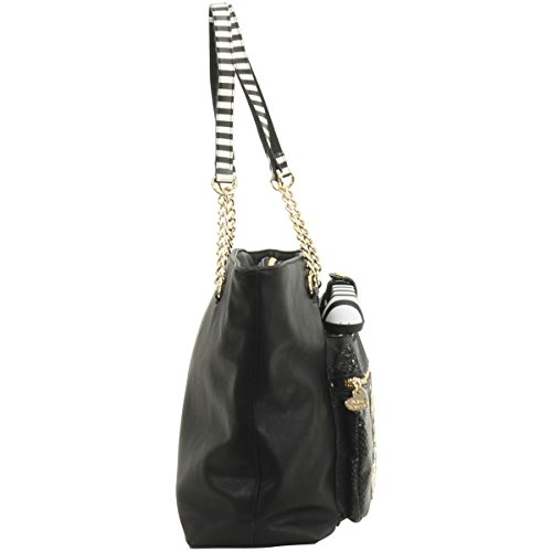 This playful tote is your best friend on the go. An attached phone makes talking on the phone a stylish accessory. The tote has partial chain double straps and zippered front pocket. Comes with phone accessory and gold tone hardware. The measurement of the tote is 11'' x 19'' x 5" and a 24" strap. Phone handle headset plugs into compatible 3.5mm jack smartphones and retro telephone shape accessory at frontFeature