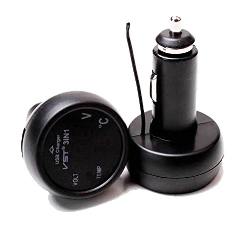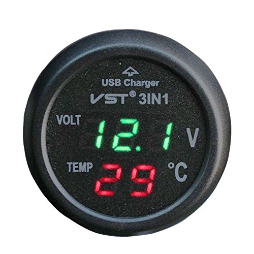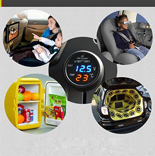 Maxfind Universal Cigarette Lighter Car USB Port Cell-Phone Charger Digital LED Display Voltmeter Thermometer Auto Gauge 3in1 12 V 24 Volt Battery Voltage Tester Temperature Monitor Meter