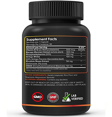 ENHANCES BRAIN HEALTH & MEMORY - Our Brain Booster supplement is a natural nootropic pill that may provide memory-enhancing results that help to improve brain health and memory. Each brain vitamin contains Vitamin B-12, Bacopa Monnieri Extract, Phosphatidylserine, Ginkgo Biloba, Rhodiola Rosea Extract and DMAE (Dimethylaminoethanol Bitartrate).