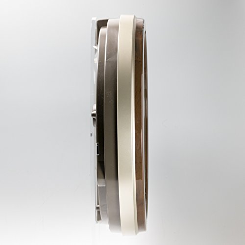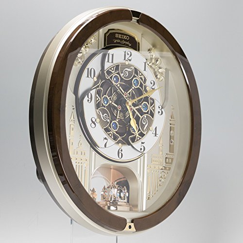 -. Feature : 本体サイズ:44.3×40.5×9.8cm / 素材・材質:プラスチック枠(薄金色パール塗装)、前面:ガラス / 原産国:タイ / ムーブメント:電波修正機能(40kHz/60kHz自動選局・受信OFF機能つき) / 付属品:単2(アルカリ)×4、単3(アルカリ)×1(電池寿命約1年間) / 正時パフォーマンス&メロディ(3ジャンルから1ジャンルを選択)、光センサーによる自動鳴止め / 音量調節、報時モニター、回転飾り(スワロフスキー®クリスタル) / 石膏ボード用掛金具つき、スイープ秒針、おやすみ秒針(光センサーによる自動秒針停止機能)