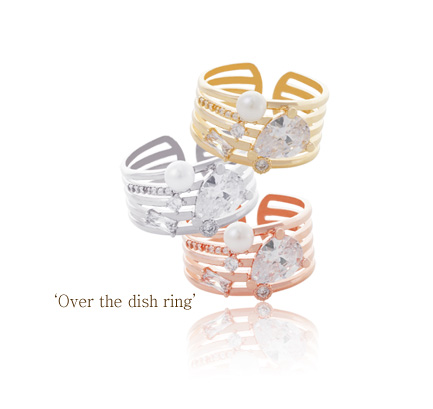 물방울과 다양한 모양의 큐빅 그리고 진주의 데코레이션이 매력적인오버 더 디쉬 반지입니다.
