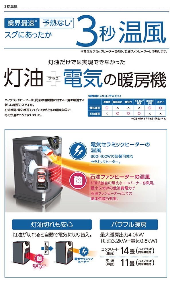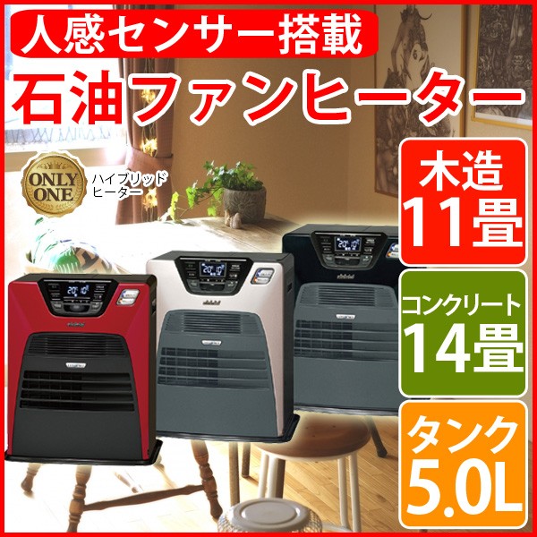 ハイブリッド暖房&人感センサー搭載【充実した機能】・小部屋モード・待機時低消費電力・ダブル消臭機能・静音タイプ・不完全燃焼防止装置・連続不完全燃焼通知機能・給油時消火機能・再点火防止機能 寸法(置台を含む)(mm) 高さ438×幅376×奥行き296 質量(Kg) 9.5 暖房出力 <ハイブリッド(同時)運転時>暖房出力:3.99kW<灯油単独時>暖房出力:3.19kW~0.79kW 畳数の目安 【ハイブリッド(同時)運転時】コンクリート(集合):14畳まで木造(戸建):11畳まで【灯油単独運転時】コンクリート(集合):12畳まで木造(戸建):9畳まで 【注意事項】商品の詳細はご注文前にメーカーサイトもしくはカタログ等で御確認ください。ご覧になっているモニター・パソコン等の環境によって実際の商品と多少色味が異なる場合がございます。予めご了承ください。検索キーワード:石油ストーブ 石油ヒーター 温風ヒーター 電気ヒーター 小型 コンパクト 省スペース