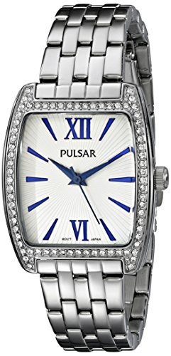 Dress watch, Japanese quartz movement, Shiny blue hands, Shiny blue sweep seconds, Applied shiny blue Roman numerals mark twelve and six o'clock, Applied shiny blue triangular markers, Matte white dial with textured sunburst design and black logo, Polished silver-tone stainless steel bracelet with adjustable links and push-button-clasp, Polished silver-tone stainless steel tonneau (barrel-shape) case encrusted with 72 genuine Swarovski® crystals, Textured steel crown, Stainless steel caseback, Curved mineral crystal, 3 ATM (30 meters/100 feet water resistant)Feature