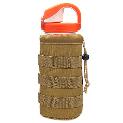 -. Feature : 7.5-inch height, 3.7-inch diameter, 3.6-oz weight. Wider and lighter than other pouch. Fit for most standard water bottle. Even can hold some a foldable umbrella or some small EDC tools for hands-free. / Inner: special water-proof Cordura, anti-skid. External: high duty nylon fabric, anti-scratch. / Drawstring closure on top to secure the bottle. Breathable and durable mesh bottom avoiding stilling water. / MOLLE design, strong buckle and solid fixing belt make itself well attached to your backpack, luggage, laptop bag, tactical vest/belt and any other lightweight plate carrier or chest rig. / Perfect for outdoor activities like traveling hiking hunting boating jogging climbing or war games and etc. Providing you with quick and easy access to water at a moment's notice.