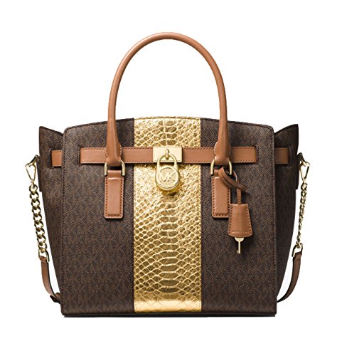 -. Brand : Michael Kors -. Department : womens -. Feature : 100% Coated Twill with Gold- or Silver-tone Hardware / Measures 14.25"W X 10.5"H X 6"D / Handle Drop: 4.25"; Adjustable Strap: 18.5"-21.25" / Interior Details: Back Zip Pocket, Back Slit Pocket, 4 Front Slit Pockets; Compatible With 13" Laptop / Top-Zip Fastening; Lining: 100% Polyester -. ProductGroup : Shoes -. ProductTypeName : HANDBAG -. Title : MICHAEL Michael Kors Hamilton Embossed-Leather and Logo Satchel