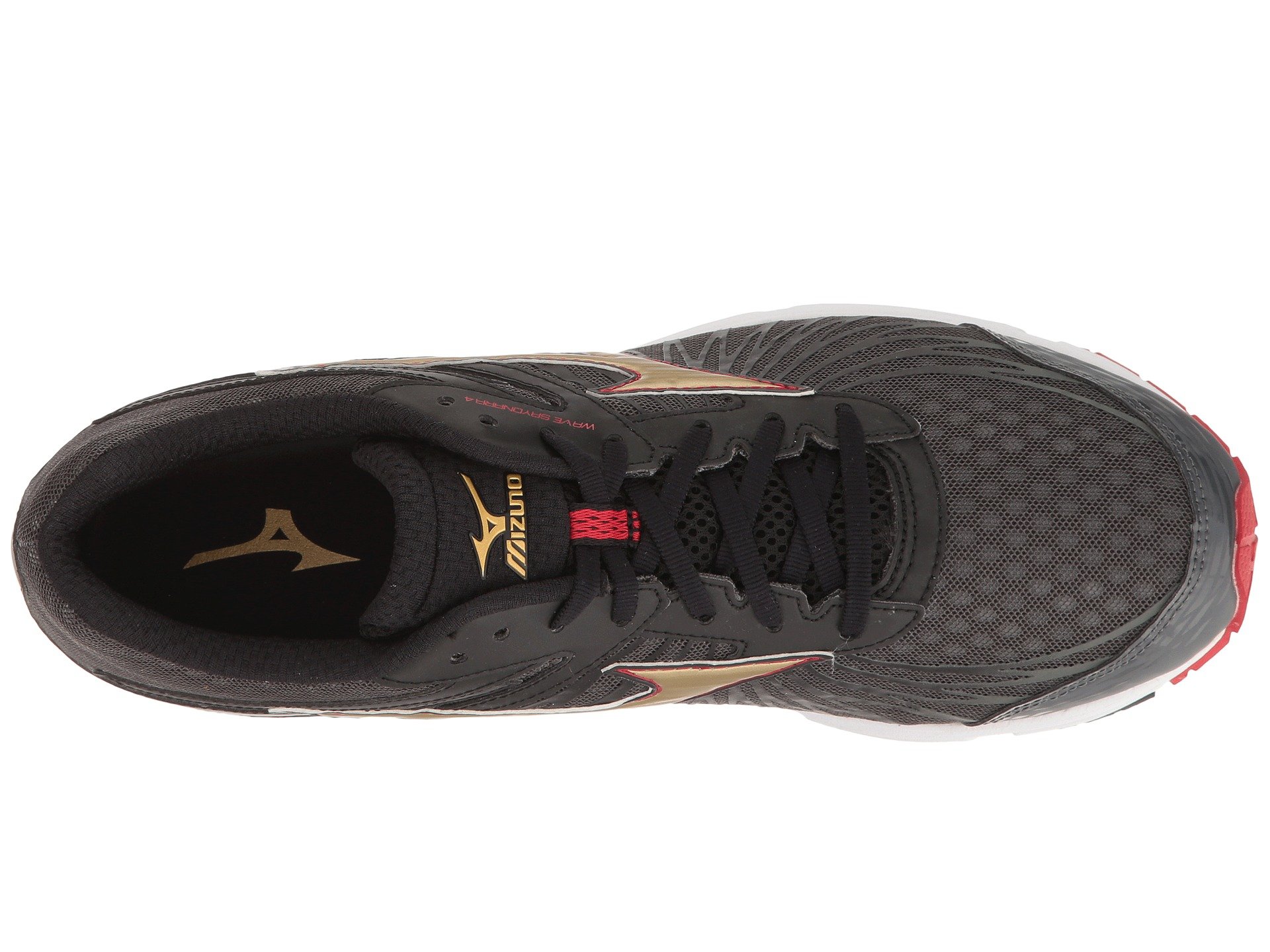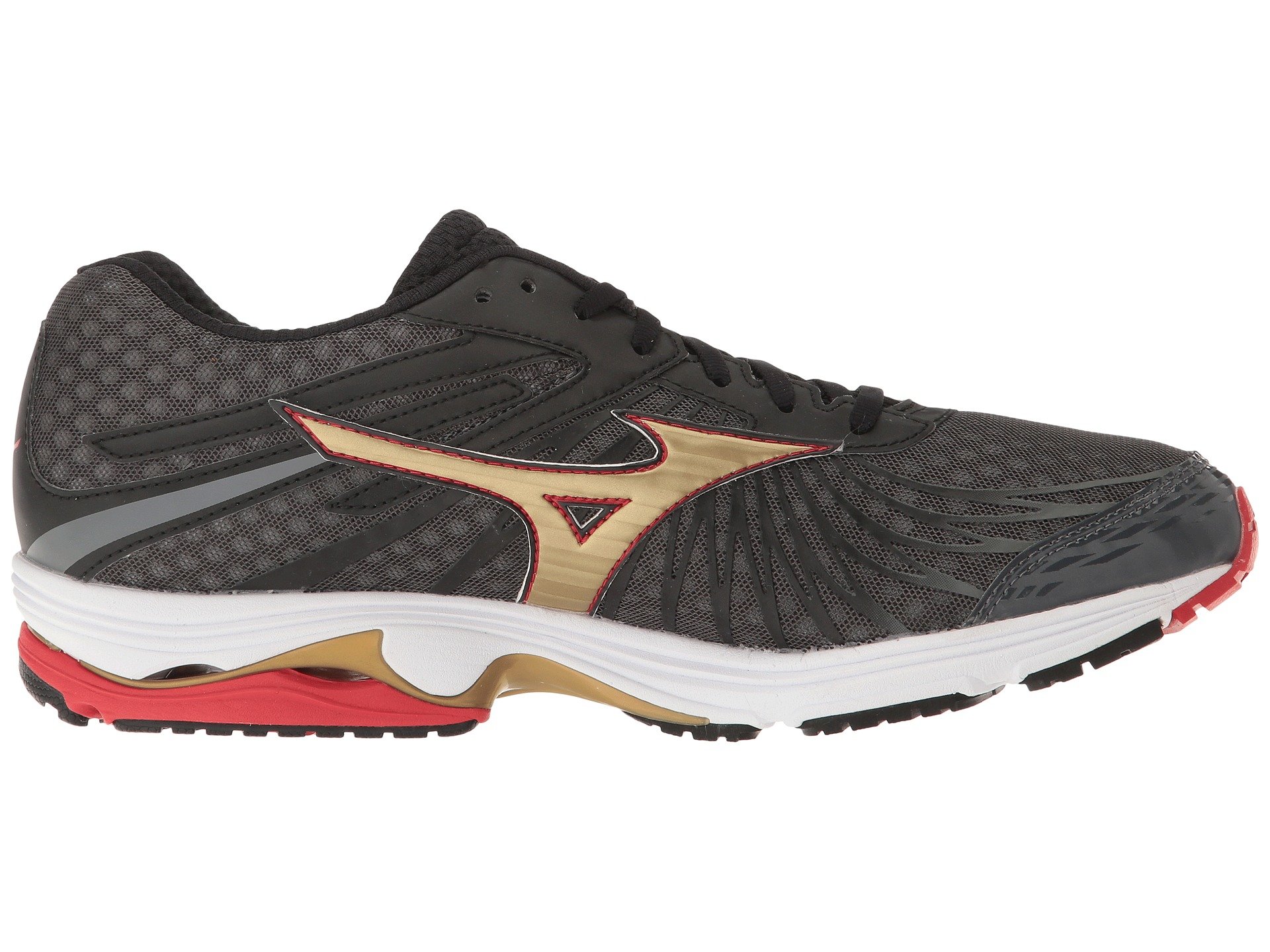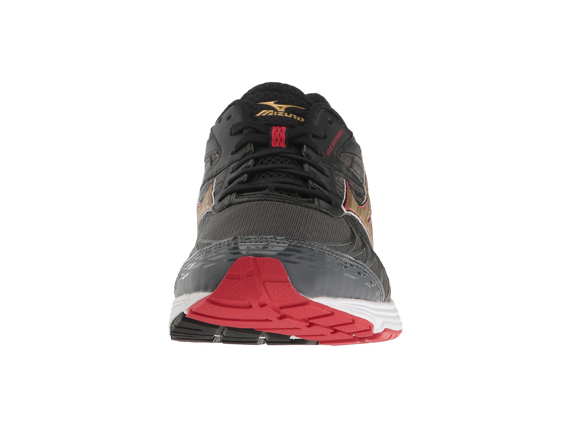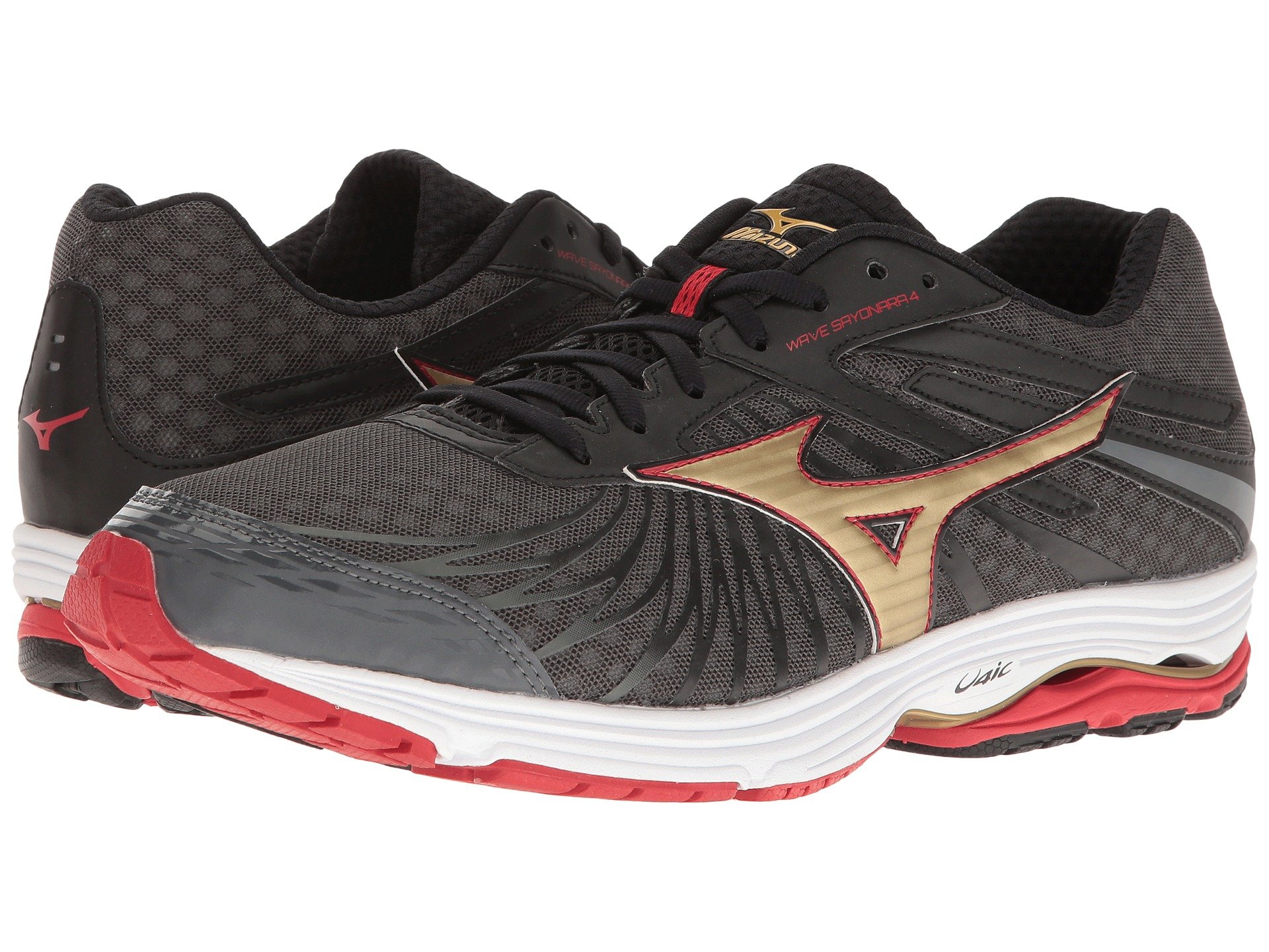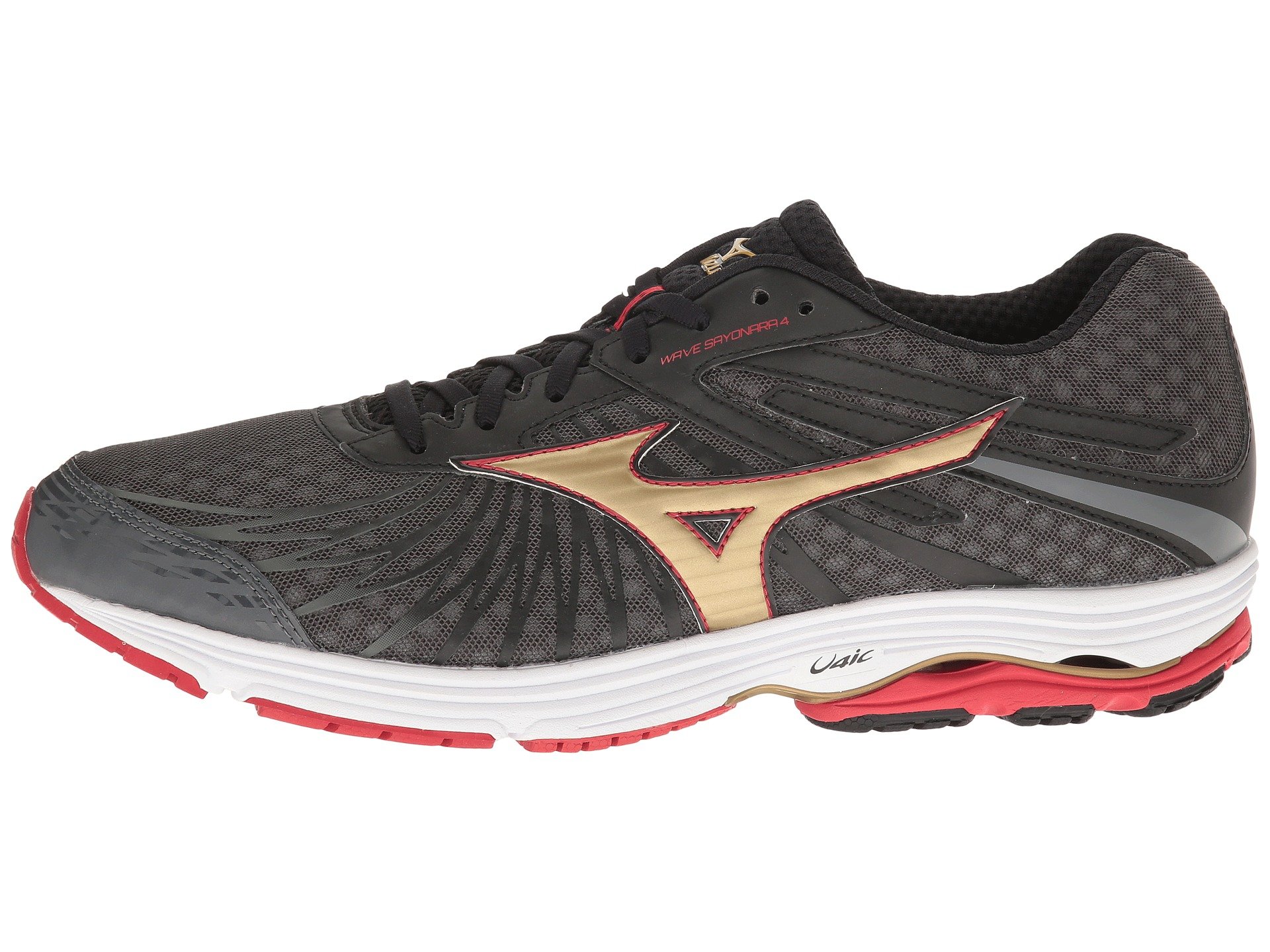 | Product Information SKU: #8718287Peace out and put the miles behind you when you hit the pavement in the Mizuno? Wave Sayonara 4 running shoe!Predecessor: Wave Sayonara 3. Support Type: Neutral to underpronation (supination).Cushioning: Lightweight, flexible response. Surface: Road.Differential: 10 mm. Breathable mesh and synthetic upper materials. Printed forefoot overlays promote a performance fit and feel. Lace-up closure.Padded tongue and collar.Breathable fabric lining. Removable foam insole.Soft, responsive U4ic midsole.Parallel Wave? in the heel provides just the right amount of cushioning and stability.Soft blown rubber at the forefoot for durability, pressure distribution, and underfoot cushioning. X10™ carbon rubber through the heel and toe for supreme traction and maximum durability.Asymmetrical forefoot flex grooves allow the foot to move more naturally.Imported. Weight of footwear is based on a single item, not a pair. |