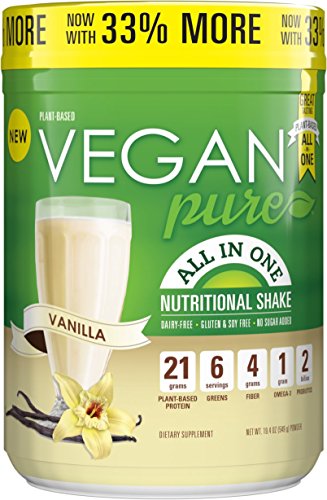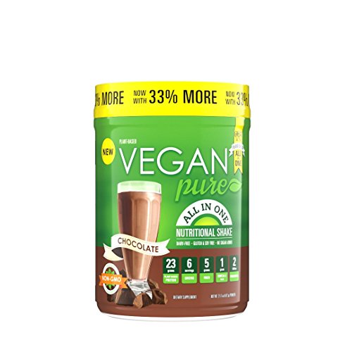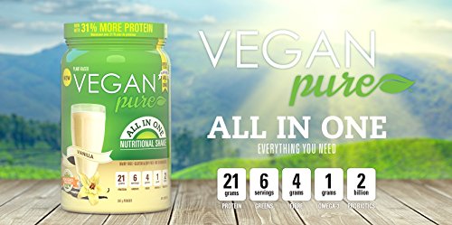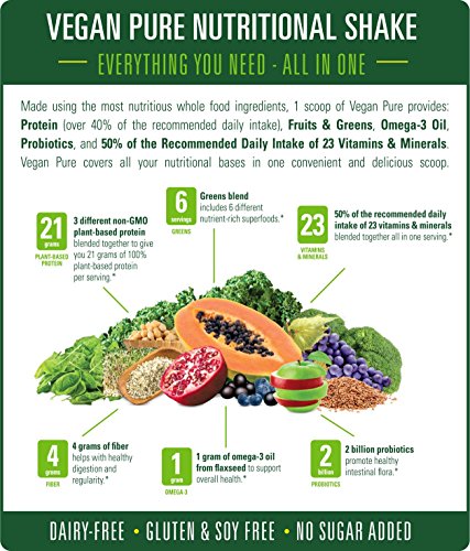 Vegan Pure is a delicious whole food nutritional powdered shake mix that is 100% plant based & provides 50% of the Recommended Daily Intake of 23 vitamins & minerals & 21g of plant-based protein & 1 gram Omega-3. Mix with your favorite non-dairy beverage.