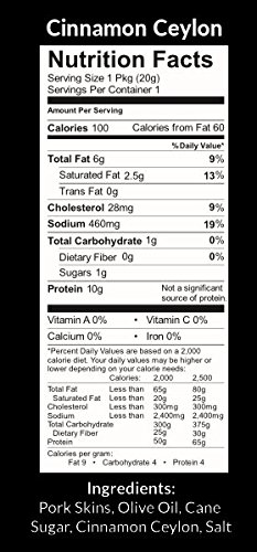 -. Feature : Cooked in Olive Oil / Seasoned with Cinnamon Ceylon / 100 Calories per Bag / 1g Carbohydrates per Bag